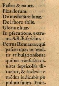 “In p[er]secutione. extrema S.R.E. sedebit. Petrus Romanus, qui pascet oves in multis tribolationibus: quibus transactis civitas septicollis diruetur, & Iudex tremendus iudicabit populum suum. Finis.”